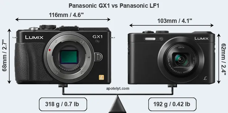 El tamaño físico y el peso de Panasonic GX1 y Panasonic LF1 se ilustran en el siguiente gráfico. Las dos cámaras se muestran según su tamaño relativo. Todas las dimensiones están redondeadas al milímetro más cercano.