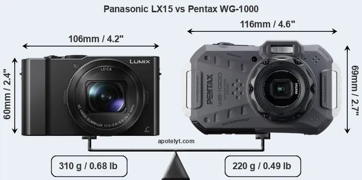 El tamaño físico y el peso de Panasonic LX15 y Pentax WG-1000 se ilustran en el siguiente gráfico. Las dos cámaras se muestran según su tamaño relativo. Todas las dimensiones están redondeadas al milímetro más cercano.