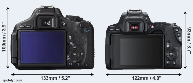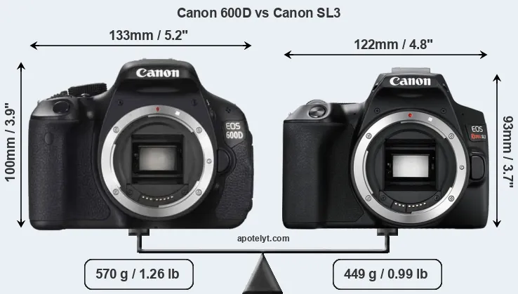 La taille physique et le poids du Canon 600D et du Canon SL3 sont illustrés dans le graphique ci-dessous. Les deux caméras sont affichées en fonction de leur taille relative. Toutes les dimensions sont arrondies au millimètre près.