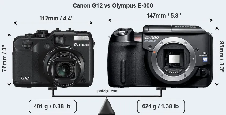 La taille physique et le poids du Canon G12 et du Olympus E-300 sont illustrés dans le graphique ci-dessous. Les deux caméras sont affichées en fonction de leur taille relative. Toutes les dimensions sont arrondies au millimètre près.