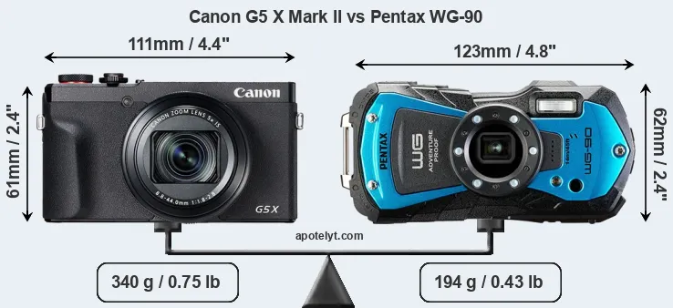 La taille physique et le poids du Canon G5 X Mark II et du Pentax WG-90 sont illustrés dans le graphique ci-dessous. Les deux caméras sont affichées en fonction de leur taille relative. Toutes les dimensions sont arrondies au millimètre près.