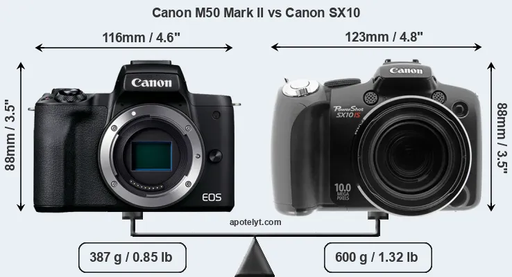 La taille physique et le poids du Canon M50 Mark II et du Canon SX10 sont illustrés dans le graphique ci-dessous. Les deux caméras sont affichées en fonction de leur taille relative. Toutes les dimensions sont arrondies au millimètre près.