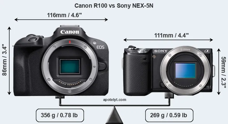 Le Canon EOS R100 et le Sony Alpha NEX-5N sont deux appareils photo numériques, qui ont été révélés au public, respectivement, en May 2023 et August 2011. Les deux sont des appareil photo à objectif interchangeable sans miroir, qui sont équipés d'un capteur APS-C. Le Canon a une résolution de 24,0 mégapixels, alors que le Sony fournit 16,0 MP.