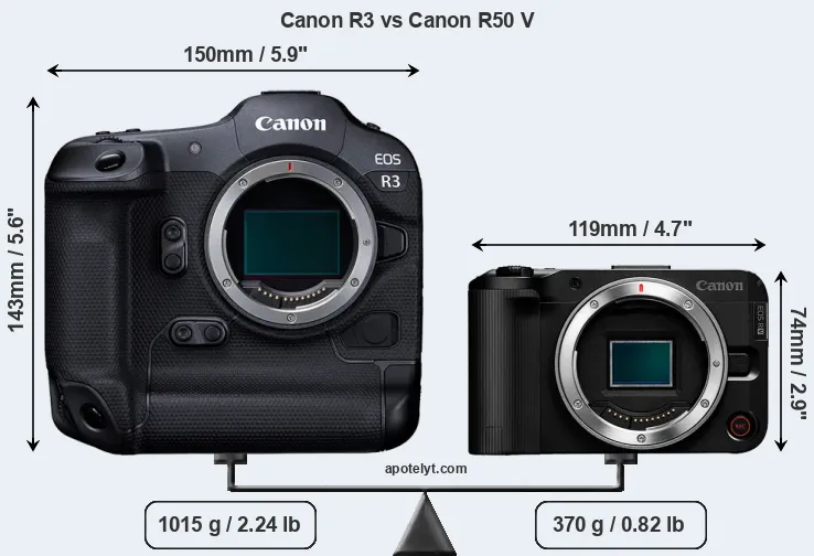 Le Canon EOS R3 et le Canon EOS R50 V sont deux appareils photo numériques, qui ont été révélés au public, respectivement, en September 2021 et March 2025. Les deux sont des appareil photo à objectif interchangeable sans miroir, qui sont équipés d'un capteur plein format (R3) et un capteur APS-C (R50 V). Les deux caméras offrent une résolution de 24,0 mégapixels.