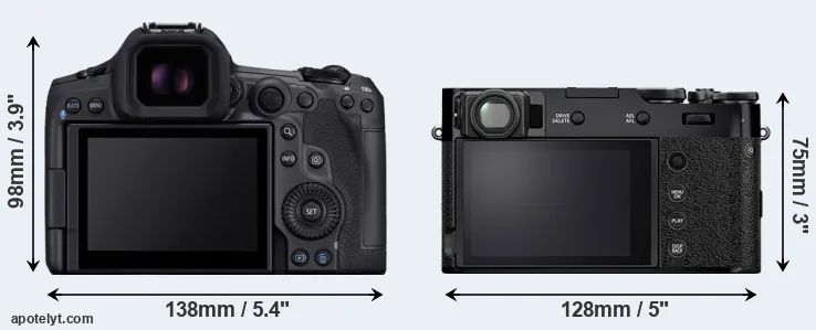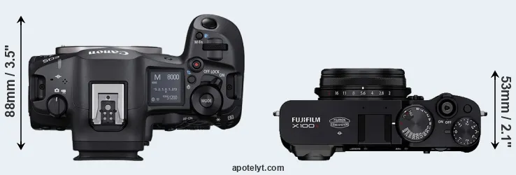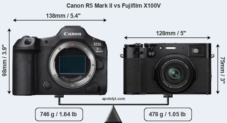 La taille physique et le poids du Canon R5 Mark II et du Fujifilm X100V sont illustrés dans le graphique ci-dessous. Les deux caméras sont affichées en fonction de leur taille relative. Toutes les dimensions sont arrondies au millimètre près.