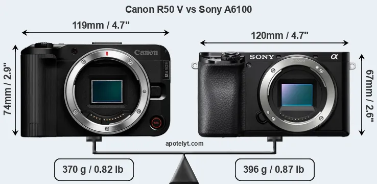 Le Canon EOS R50 V et le Sony Alpha A6100 sont deux appareils photo numériques, qui ont été révélés au public, respectivement, en March 2025 et August 2019. Les deux sont des appareil photo à objectif interchangeable sans miroir, qui sont équipés d'un capteur APS-C. Les deux caméras offrent une résolution de 24,0 mégapixels.