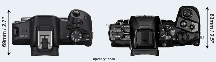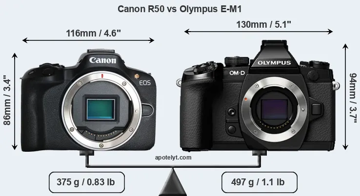 Le Canon EOS R50 et le Olympus OM-D E-M1 sont deux appareils photo numériques, qui ont été révélés au public, respectivement, en February 2023 et September 2013. Les deux sont des appareil photo à objectif interchangeable sans miroir, qui sont équipés d'un capteur APS-C (R50) et un capteur quatre tiers (E-M1). Le Canon a une résolution de 24,0 mégapixels, alors que le Olympus fournit 15,9 MP.