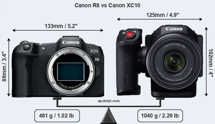 La taille physique et le poids du Canon R8 et du Canon XC10 sont illustrés dans le graphique ci-dessous. Les deux caméras sont affichées en fonction de leur taille relative. Toutes les dimensions sont arrondies au millimètre près.