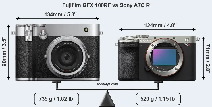 La taille physique et le poids du Fujifilm GFX 100RF et du Sony A7C R sont illustrés dans le graphique ci-dessous. Les deux caméras sont affichées en fonction de leur taille relative. Toutes les dimensions sont arrondies au millimètre près.
