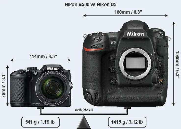 La taille physique et le poids du Nikon B500 et du Nikon D5 sont illustrés dans le graphique ci-dessous. Les deux caméras sont affichées en fonction de leur taille relative. Toutes les dimensions sont arrondies au millimètre près.