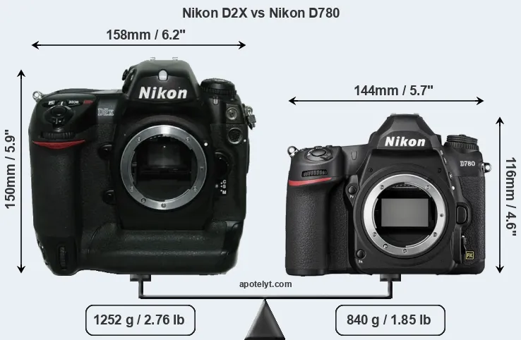 La taille physique et le poids du Nikon D2X et du Nikon D780 sont illustrés dans le graphique ci-dessous. Les deux caméras sont affichées en fonction de leur taille relative. Toutes les dimensions sont arrondies au millimètre près.