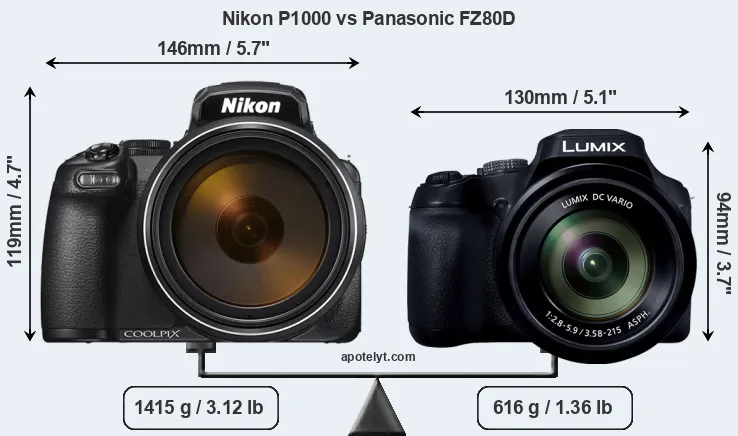 La taille physique et le poids du Nikon P1000 et du Panasonic FZ80D sont illustrés dans le graphique ci-dessous. Les deux caméras sont affichées en fonction de leur taille relative. Toutes les dimensions sont arrondies au millimètre près.