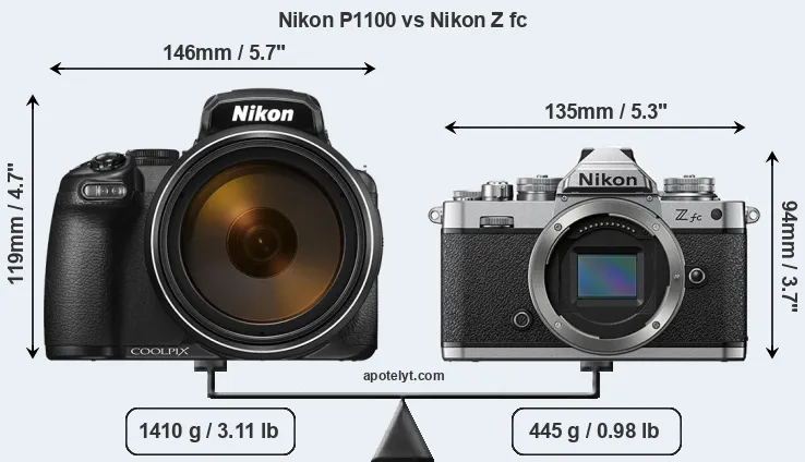 La taille physique et le poids du Nikon P1100 et du Nikon Z fc sont illustrés dans le graphique ci-dessous. Les deux caméras sont affichées en fonction de leur taille relative. Toutes les dimensions sont arrondies au millimètre près.