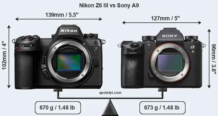 La taille physique et le poids du Nikon Z6 III et du Sony A9 sont illustrés dans le graphique ci-dessous. Les deux caméras sont affichées en fonction de leur taille relative. Toutes les dimensions sont arrondies au millimètre près.