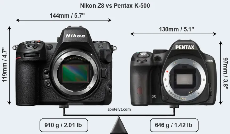 Au-delà de cet instantané des principales fonctionnalités et caractéristiques, quelles sont les différences entre le Nikon Z8 et le Pentax K-500 ? Lequel devriez-vous acheter ? Lisez la suite pour découvrir comment ces deux appareils photo se comparent en ce qui concerne leur taille et d'autres détails.