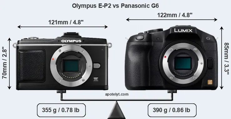 Le Olympus PEN E-P2 et le Panasonic Lumix DMC-G6 sont deux appareils photo numériques, qui ont été révélés au public, respectivement, en November 2009 et April 2013. Les deux sont des appareil photo à objectif interchangeable sans miroir, qui sont équipés d'un capteur quatre tiers. Le Olympus a une résolution de 12,2 mégapixels, alors que le Panasonic fournit 15,9 MP.