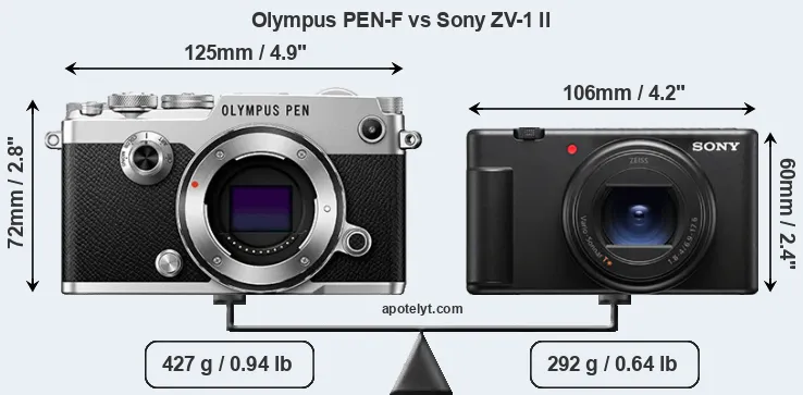 Le Olympus PEN-F et le Sony Cyber-shot ZV-1 II sont deux appareils photo numériques, qui ont été révélés au public, respectivement, en January 2016 et May 2023. Le PEN-F est un appareil photo à objectif interchangeable sans miroir, tandis que le ZV-1 II est un appareil photo compact à objectif intégré. Les caméras sont équipés d'un capteur quatre tiers (PEN-F) et un capteur de 1 pouce (ZV-1 II). Le Olympus a une résolution de 20,2 mégapixels, alors que le Sony fournit 20,0 MP.