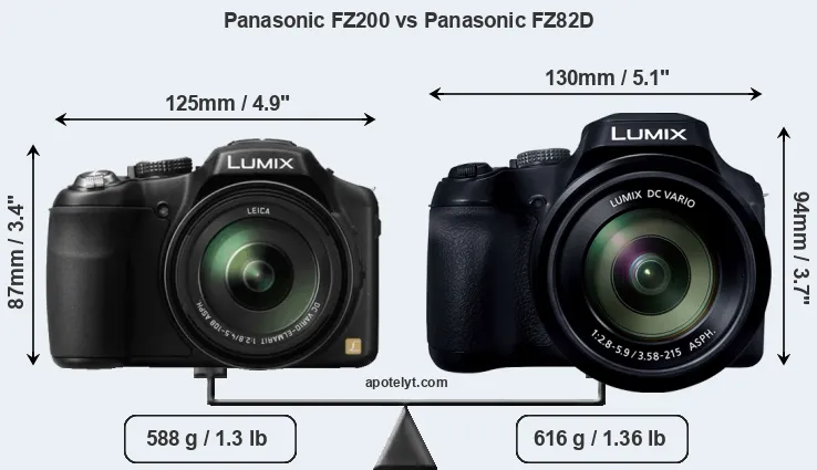 La taille physique et le poids du Panasonic FZ200 et du Panasonic FZ82D sont illustrés dans le graphique ci-dessous. Les deux caméras sont affichées en fonction de leur taille relative. Toutes les dimensions sont arrondies au millimètre près.