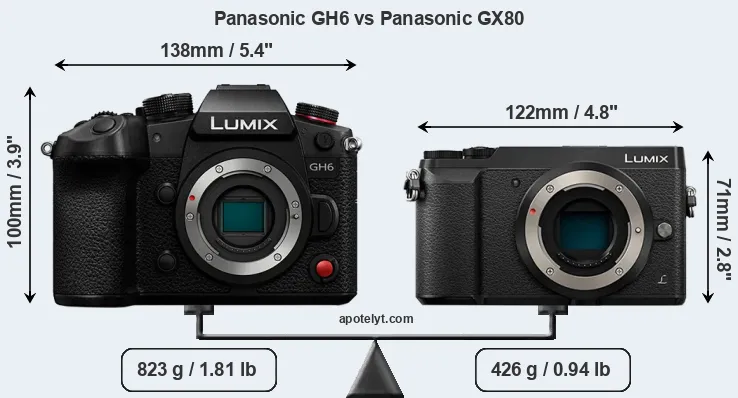 La taille physique et le poids du Panasonic GH6 et du Panasonic GX80 sont illustrés dans le graphique ci-dessous. Les deux caméras sont affichées en fonction de leur taille relative. Toutes les dimensions sont arrondies au millimètre près.