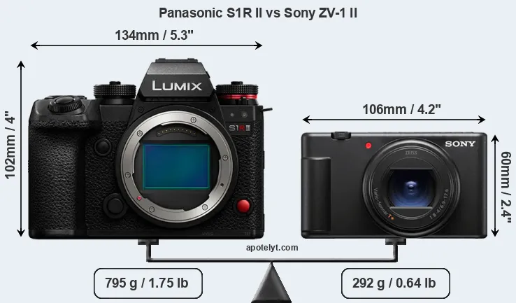 La taille physique et le poids du Panasonic S1R II et du Sony ZV-1 II sont illustrés dans le graphique ci-dessous. Les deux caméras sont affichées en fonction de leur taille relative. Toutes les dimensions sont arrondies au millimètre près.