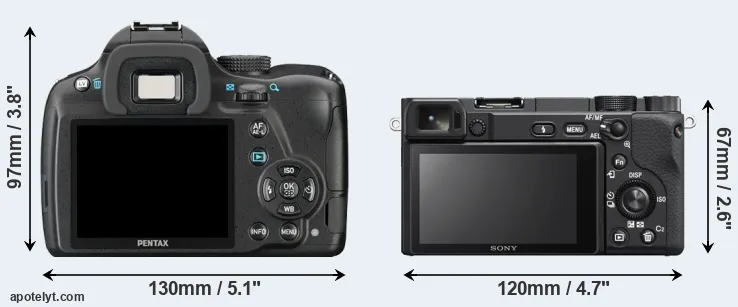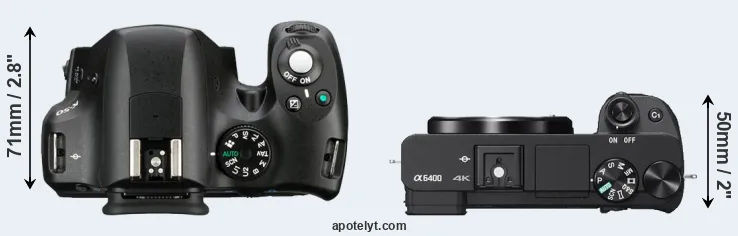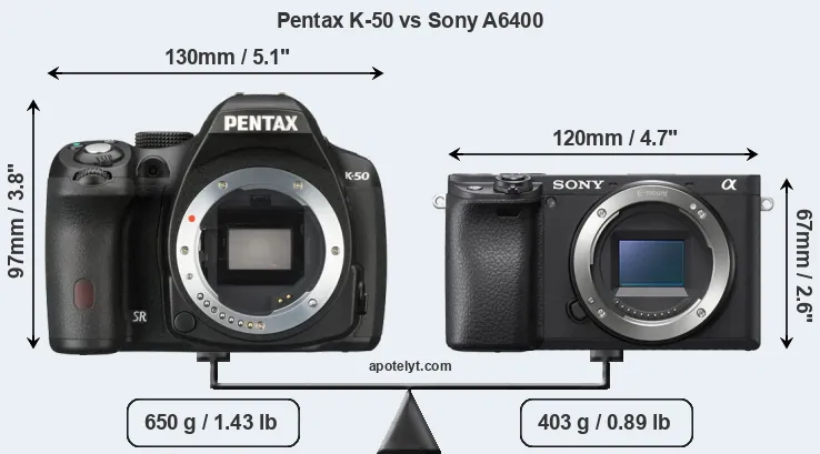 La taille physique et le poids du Pentax K-50 et du Sony A6400 sont illustrés dans le graphique ci-dessous. Les deux caméras sont affichées en fonction de leur taille relative. Toutes les dimensions sont arrondies au millimètre près.