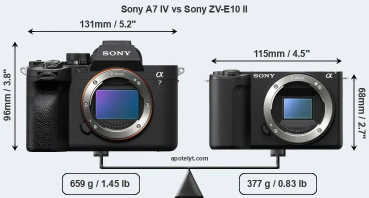 Le Sony Alpha A7 IV et le Sony ZV-E10 II sont deux appareils photo numériques, qui ont été révélés au public, respectivement, en October 2021 et July 2024. Les deux sont des appareil photo à objectif interchangeable sans miroir, qui sont équipés d'un capteur plein format (A7 IV) et un capteur APS-C (ZV-E10 II). Le A7 IV a une résolution de 32,7 mégapixels, alors que le ZV-E10 II fournit 25,6 MP.