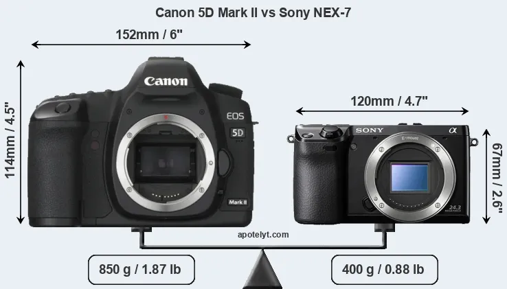 La Canon EOS 5D Mark II e la Sony Alpha NEX-7 sono due fotocamere digitali rivelate al pubblico rispettivamente a settembre 2008 e agosto 2011. Il 5D Mark II è una fotocamera DSLR, mentre NEX-7 è una fotocamera mirrorless con obiettivo intercambiabile.Le fotocamere sono dotati di un sensore full frame (5D Mark II) e un sensore APS-C (NEX-7). La Canon ha una risoluzione di 21,0 megapixel, mentre la Sony fornisce 24,0 MP.