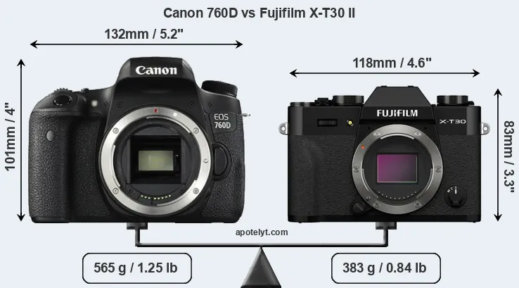 La Canon EOS 760D e la Fujifilm X-T30 II sono due fotocamere digitali rivelate al pubblico rispettivamente a febbraio 2015 e settembre 2021. Il 760D è una fotocamera DSLR, mentre X-T30 II è una fotocamera mirrorless con obiettivo intercambiabile.Entrambe le fotocamere sono dotati di un sensore APS-C. La Canon ha una risoluzione di 24,0 megapixel, mentre la Fujifilm fornisce 26,0 MP.