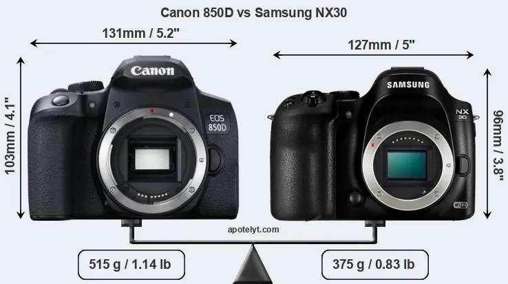La dimensione fisica e il peso della Canon 850D e Samsung NX30 sono illustrate nel grafico sottostante. Le due fotocamere vengono visualizzate in base alle loro dimensioni relative. Tutte le dimensioni sono arrotondate al millimetro più vicino.