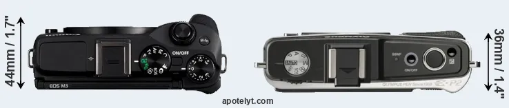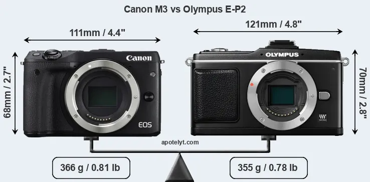 La Canon EOS M3 e la Olympus PEN E-P2 sono due fotocamere digitali rivelate al pubblico rispettivamente a febbraio 2015 e novembre 2009. Entrambe sono fotocamera mirrorless con obiettivo intercambiabile, che sono dotati di un sensore APS-C (M3) e un sensore Quattro Terzi (E-P2). La Canon ha una risoluzione di 24,0 megapixel, mentre la Olympus fornisce 12,2 MP.