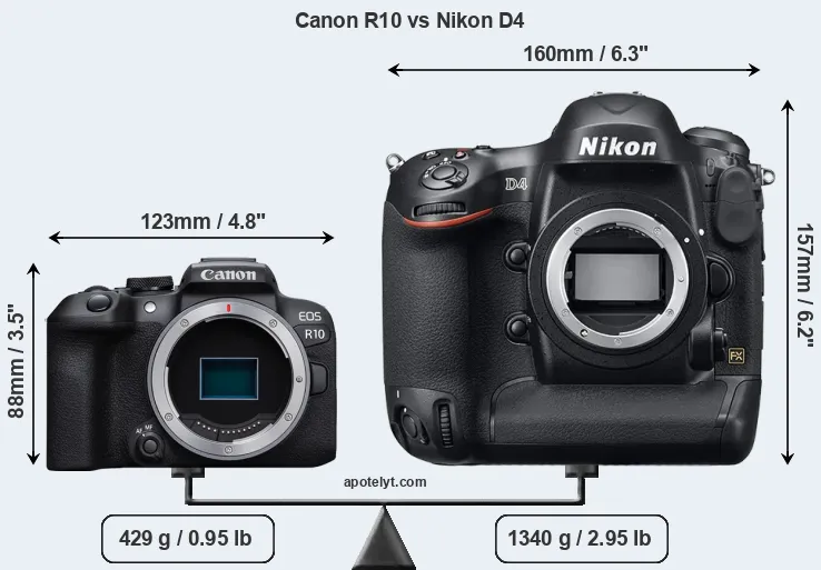 La dimensione fisica e il peso della Canon R10 e Nikon D4 sono illustrate nel grafico sottostante. Le due fotocamere vengono visualizzate in base alle loro dimensioni relative. Tutte le dimensioni sono arrotondate al millimetro più vicino.