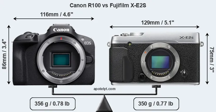 La Canon EOS R100 e la Fujifilm X-E2S sono due fotocamere digitali rivelate al pubblico rispettivamente a maggio 2023 e gennaio 2016. Entrambe sono fotocamera mirrorless con obiettivo intercambiabile, che sono dotati di un sensore APS-C. La Canon ha una risoluzione di 24,0 megapixel, mentre la Fujifilm fornisce 16,0 MP.