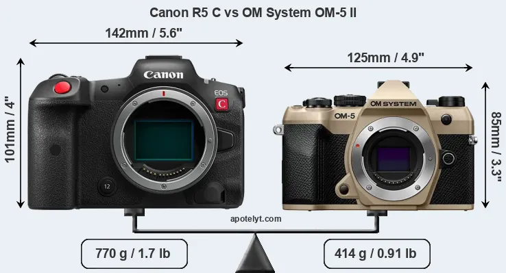 La Canon EOS R5 C e la OM System OM-5 II sono due fotocamere digitali rivelate al pubblico rispettivamente a gennaio 2022 e giugno 2025. Entrambe sono fotocamera mirrorless con obiettivo intercambiabile, che sono dotati di un sensore full frame (R5 C) e un sensore Quattro Terzi (OM-5 II). La Canon ha una risoluzione di 44,8 megapixel, mentre la OM System fornisce 20,2 MP.