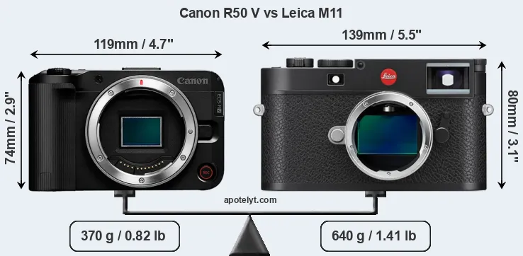 La dimensione fisica e il peso della Canon R50 V e Leica M11 sono illustrate nel grafico sottostante. Le due fotocamere vengono visualizzate in base alle loro dimensioni relative. Tutte le dimensioni sono arrotondate al millimetro più vicino.