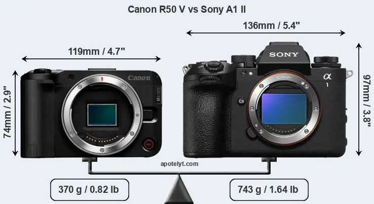 La dimensione fisica e il peso della Canon R50 V e Sony A1 II sono illustrate nel grafico sottostante. Le due fotocamere vengono visualizzate in base alle loro dimensioni relative. Tutte le dimensioni sono arrotondate al millimetro più vicino.