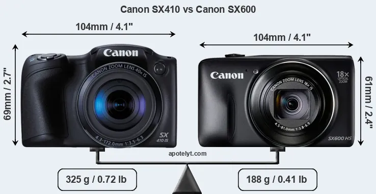 La Canon PowerShot SX410 IS e la Canon PowerShot SX600 HS sono due fotocamere digitali rivelate al pubblico rispettivamente a febbraio 2015 e gennaio 2014. Sia il SX410 e il SX600 sono fotocamere compatte con obiettivo integrato, che sono dotati di un sensore da 1/2.3 pollice. La SX410 ha una risoluzione di 19,9 megapixel, mentre la SX600 fornisce 15,9 MP.
