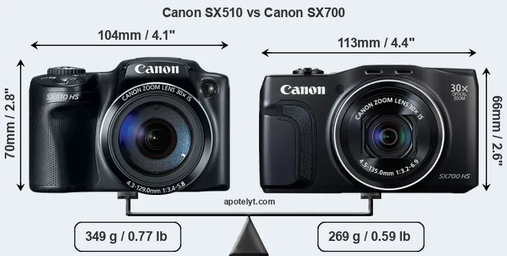 La dimensione fisica e il peso della Canon SX510 e Canon SX700 sono illustrate nel grafico sottostante. Le due fotocamere vengono visualizzate in base alle loro dimensioni relative. Tutte le dimensioni sono arrotondate al millimetro più vicino.