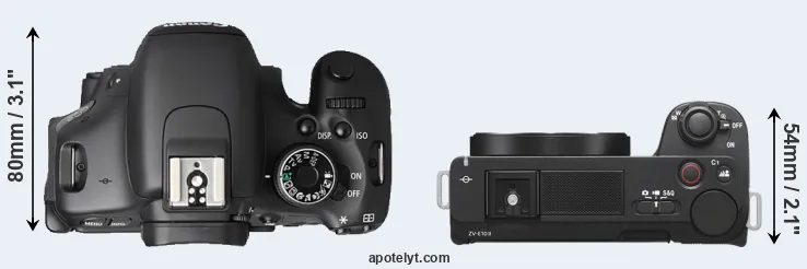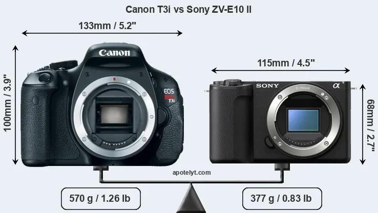 La dimensione fisica e il peso della Canon T3i e Sony ZV-E10 II sono illustrate nel grafico sottostante. Le due fotocamere vengono visualizzate in base alle loro dimensioni relative. Tutte le dimensioni sono arrotondate al millimetro più vicino.