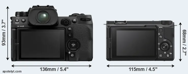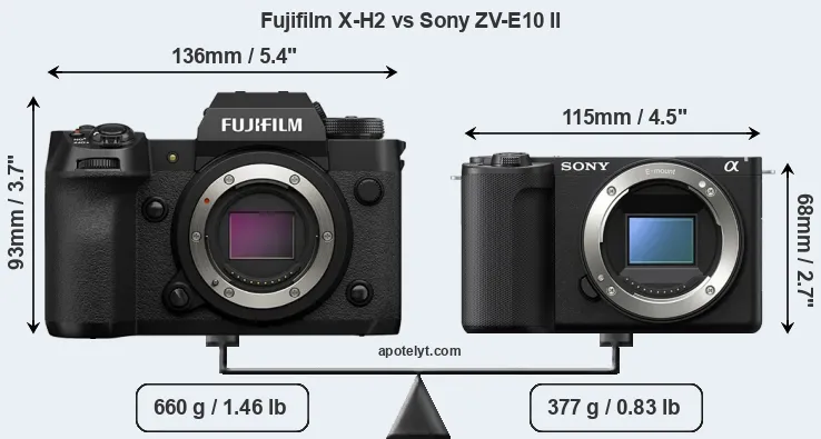 La dimensione fisica e il peso della Fujifilm X-H2 e Sony ZV-E10 II sono illustrate nel grafico sottostante. Le due fotocamere vengono visualizzate in base alle loro dimensioni relative. Tutte le dimensioni sono arrotondate al millimetro più vicino.