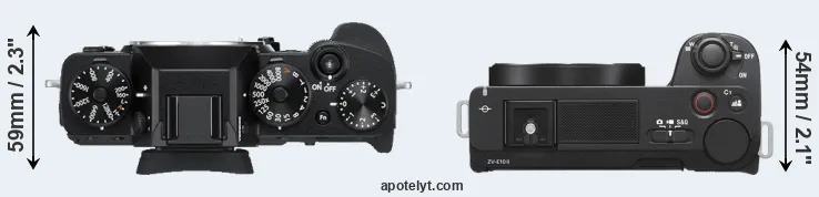 La dimensione fisica e il peso della Fujifilm X-T3 e Sony ZV-E10 II sono illustrate nel grafico sottostante. Le due fotocamere vengono visualizzate in base alle loro dimensioni relative. Tutte le dimensioni sono arrotondate al millimetro più vicino.