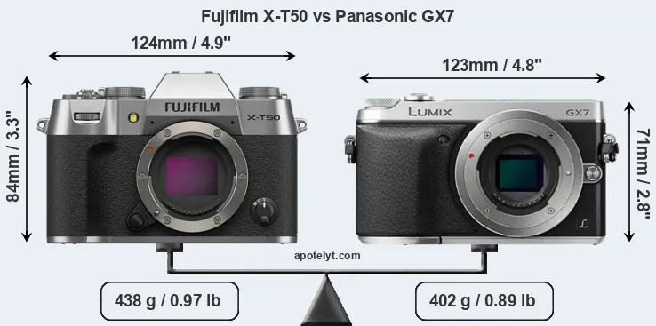 La dimensione fisica e il peso della Fujifilm X-T50 e Panasonic GX7 sono illustrate nel grafico sottostante. Le due fotocamere vengono visualizzate in base alle loro dimensioni relative. Tutte le dimensioni sono arrotondate al millimetro più vicino.