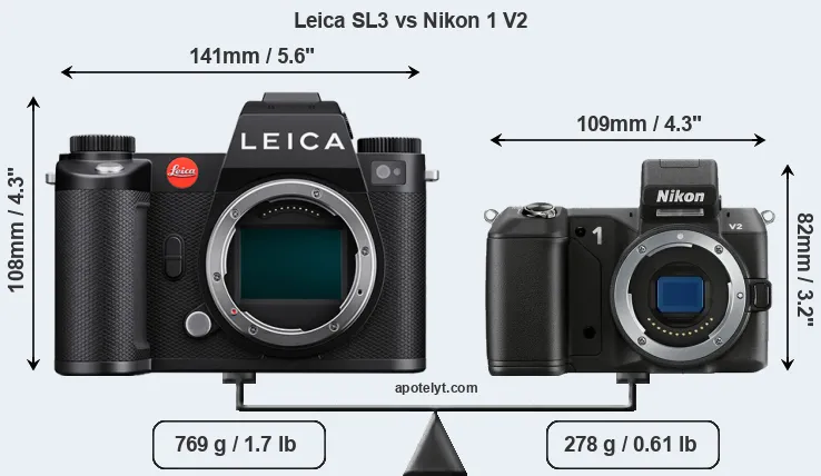La dimensione fisica e il peso della Leica SL3 e Nikon 1 V2 sono illustrate nel grafico sottostante. Le due fotocamere vengono visualizzate in base alle loro dimensioni relative. Tutte le dimensioni sono arrotondate al millimetro più vicino.