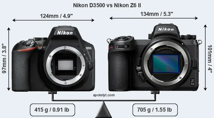 La Nikon D3500 e la Nikon Z6 II sono due fotocamere digitali rivelate al pubblico rispettivamente a agosto 2018 e ottobre 2020. Il D3500 è una fotocamera DSLR, mentre Z6 II è una fotocamera mirrorless con obiettivo intercambiabile.Le fotocamere sono dotati di un sensore APS-C (D3500) e un sensore full frame (Z6 II). La D3500 ha una risoluzione di 24,0 megapixel, mentre la Z6 II fornisce 24,3 MP.