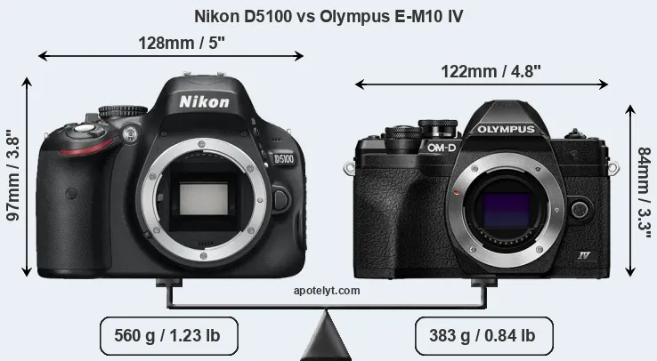 La dimensione fisica e il peso della Nikon D5100 e Olympus E-M10 IV sono illustrate nel grafico sottostante. Le due fotocamere vengono visualizzate in base alle loro dimensioni relative. Tutte le dimensioni sono arrotondate al millimetro più vicino.