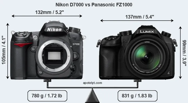 La dimensione fisica e il peso della Nikon D7000 e Panasonic FZ1000 sono illustrate nel grafico sottostante. Le due fotocamere vengono visualizzate in base alle loro dimensioni relative. Tutte le dimensioni sono arrotondate al millimetro più vicino.