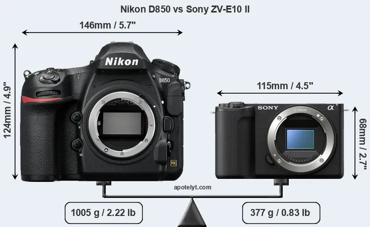 La dimensione fisica e il peso della Nikon D850 e Sony ZV-E10 II sono illustrate nel grafico sottostante. Le due fotocamere vengono visualizzate in base alle loro dimensioni relative. Tutte le dimensioni sono arrotondate al millimetro più vicino.