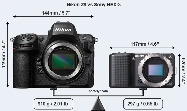 Andando oltre questa istantanea delle caratteristiche e delle caratteristiche principali, quali sono le differenze tra Nikon Z8 e Sony Alpha NEX-3? Quale dovresti comprare? Continua a leggere per scoprire come si confrontano queste due fotocamere rispetto alle dimensioni del corpo e altre caratteristiche.