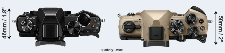 La dimensione fisica e il peso della Olympus E-M10 e OM System OM-5 II sono illustrate nel grafico sottostante. Le due fotocamere vengono visualizzate in base alle loro dimensioni relative. Tutte le dimensioni sono arrotondate al millimetro più vicino.