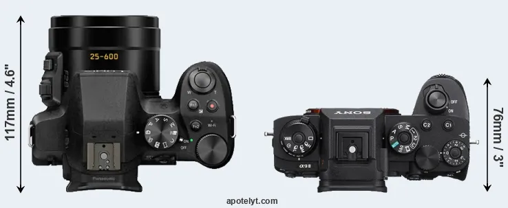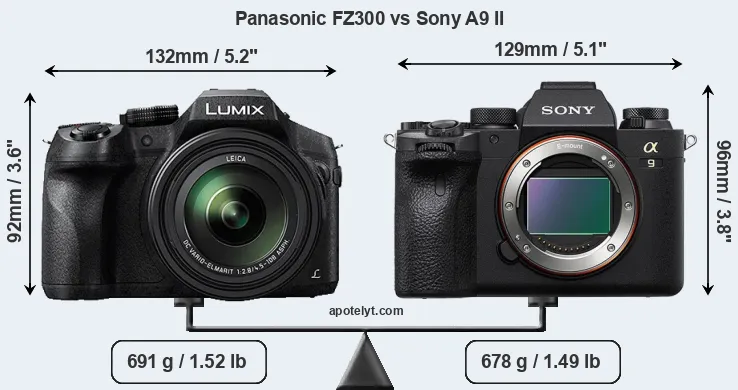 La dimensione fisica e il peso della Panasonic FZ300 e Sony A9 II sono illustrate nel grafico sottostante. Le due fotocamere vengono visualizzate in base alle loro dimensioni relative. Tutte le dimensioni sono arrotondate al millimetro più vicino.