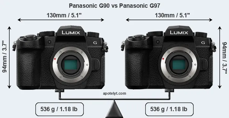 La dimensione fisica e il peso della Panasonic G90 e Panasonic G97 sono illustrate nel grafico sottostante. Le due fotocamere vengono visualizzate in base alle loro dimensioni relative. Tutte le dimensioni sono arrotondate al millimetro più vicino.